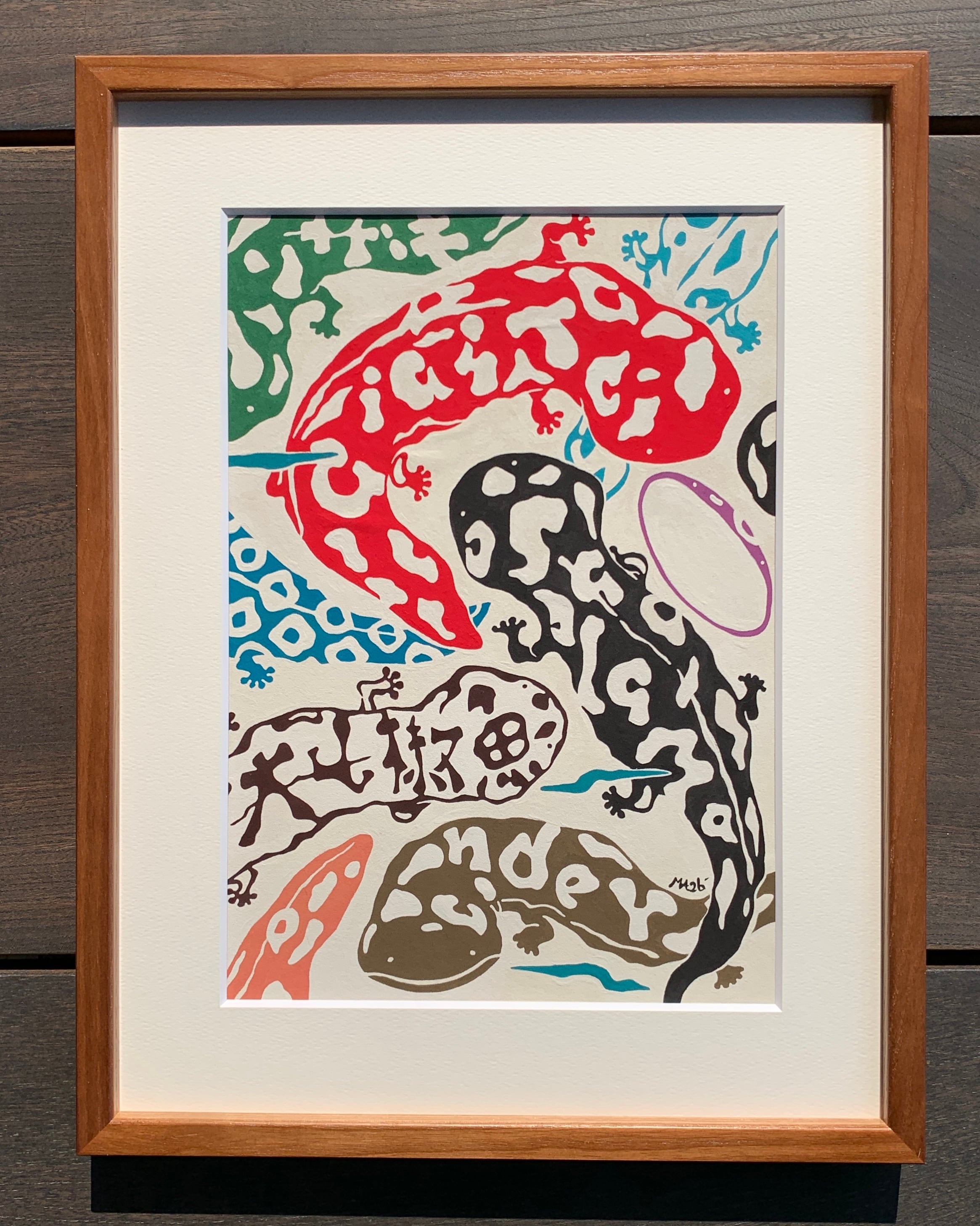 開催中の足立真人イラスト展『まほろの世界〜オオサンショウウオの日々』の原画になります。