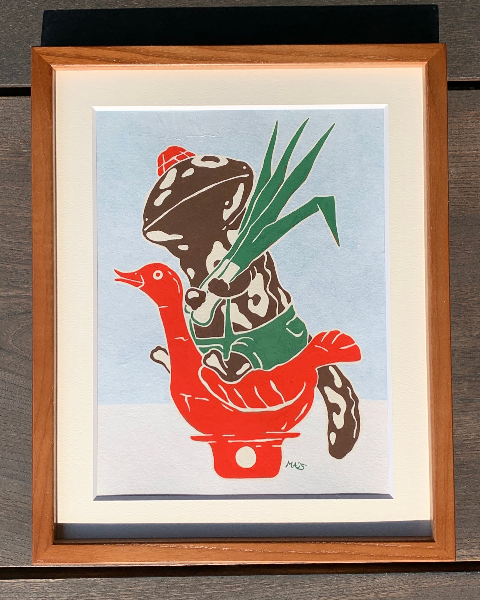 開催中の足立真人イラスト展『まほろの世界〜オオサンショウウオの日々』の原画になります。