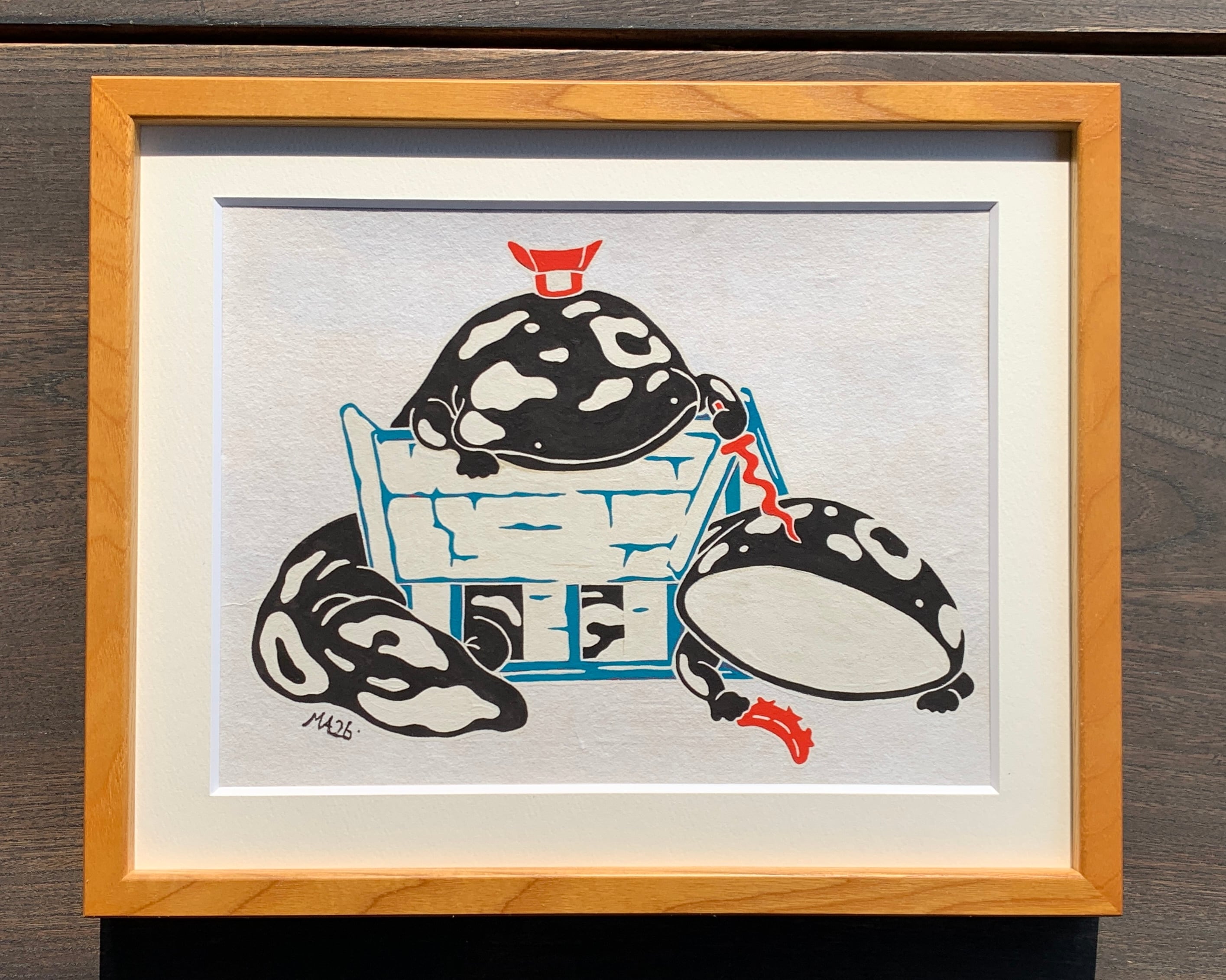 開催中の足立真人イラスト展『まほろの世界〜オオサンショウウオの日々』の原画になります。
