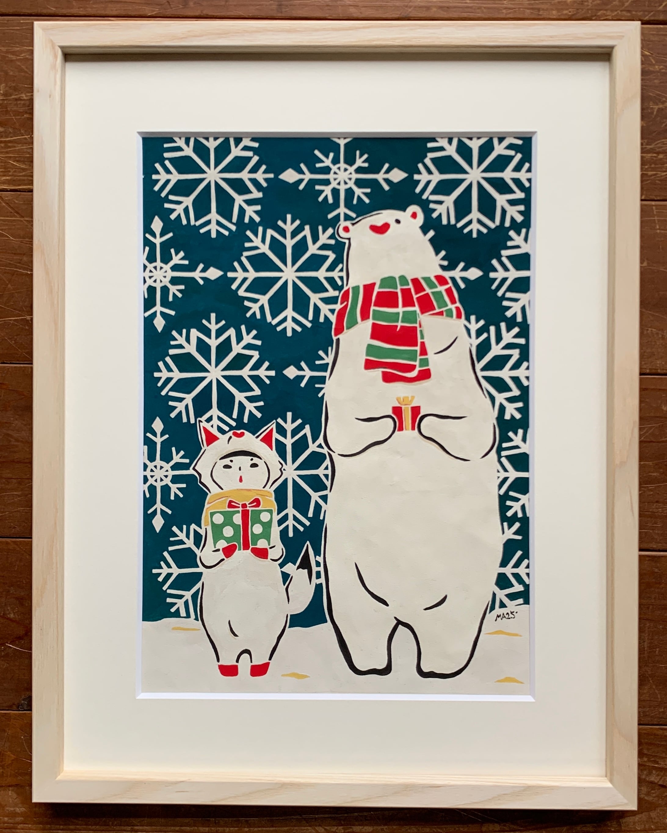 開催中の足立真人イラスト展『まほろの世界〜オオサンショウウオの日々』の原画になります。